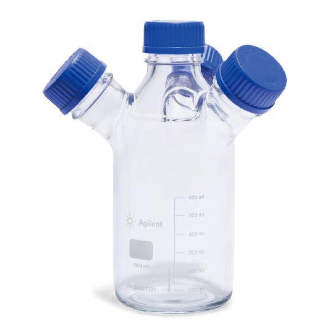 溶媒暴露防止用ボトル(セーフティパージボトル)は最大4本の溶媒ラインをキャップで設置・固定可能、複数のラインを溶媒でパージする洗浄時などにご使用いただける便利なボトルです。
