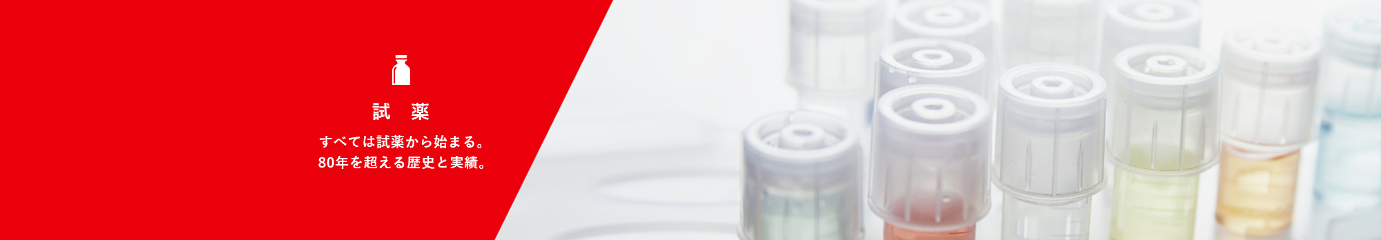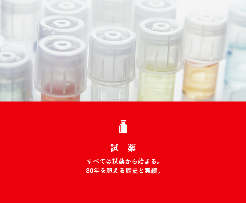 1944年の創立から80年以上にわたり、わたしたちが生み出してきた試薬はカタログへの掲載製品だけでも50,000品目を超えていますが、実際にはカタログに載っていない多くの試薬を開発しています。また、お客さまに研究段階からニーズを聞き出し、用途に合わせたオリジナルの試薬を少量から提供することで、あらゆるメーカーのモノづくりに貢献しています。